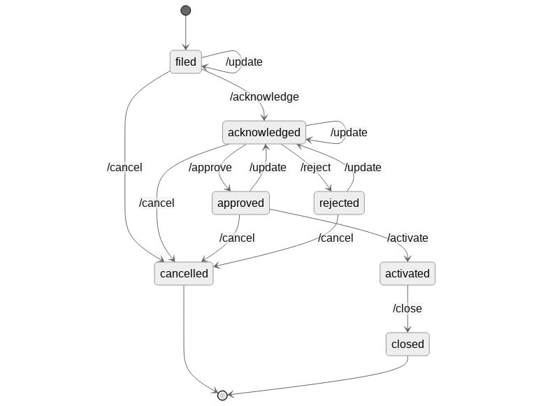 filed - The Drone Operation Plan is filed by an operator to be approved by ATC/authorityacknowledged - The Drone Operation Plan is acknowledged by ATC/authorityapproved - The Drone Operation Plan is approved by ATC/authorityapproved_with_restrictions - Same as approved but with some restrictions imposed by the ATC/authorityactivated - The Drone Operation Plan is currently running between the expected time slotclosed - The Drone Operation Plan is closed after its completioncancelled - The Drone Operation Plan is cancelled by the drone operator/ownerrejected - The Drone Operation Plan is rejected by ATC/authorityHere is the state diagram for the status. approved_with_restrictions has the same transitions as approved and is therefore hidden to improve readability.